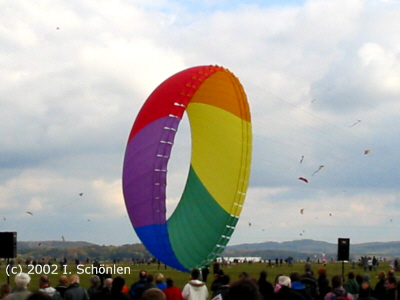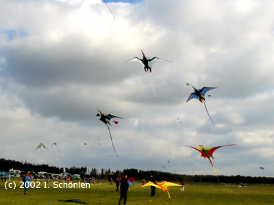 ... und der Himmel ist voller Farben Am 12. und 13. Oktober 2002 auf dem Sportflugplatz bei Renningen-Malmsheim in der Nähe von Leonberg. Wo man sonst Segelflieger und Sportflugzeuge sieht, ist der Himmel voller Drachen. Aber Drachen ist nicht gleich Drachen. Da gibt es Ein- und Zweileinerdrachen, Sportlenkdrachen, Kastendrachen, asiatische Flachdrachen, "Flugsaurier" und in der Nacht auch beleuchtete und reflektierende Drachen. Aber das ist nur eine sehr kleine Auswahl. Auf dem etwa 100 x 100 m großen Aktionsfeld sieht man so ziemlich alles was die Fantasie hergibt. Nur eine Art von Drachen haben wir nicht gefunden: den klassischen Drachen. Sie wissen schon, den mit Lattenkreuz, umlaufender Schnur und mit bunter Papierbespannung. Gibt es diesen Drachen überhaupt noch? Bei den verschiedenen Wettkämpfen und Schauflügen war aber festzustellen, dass Drachenfliegen und Drachenbau immer noch jung und alt begeistert. Es war ein Fest für die ganze Familie, was noch durch das Rahmenprogramm unterstrichen wurde. Die Kleinen konnten in einem Drachenworkshop ihren eigen Drachen bauen und stolz dem Publikum präsentieren. Kinderkarussell und Schminkstation hatten ebenfalls reichlich Zulauf. Aber außer den Drachen waren auch noch andere Luftakrobaten anwesend. Bumerang und Heißluftballon sprachen aber eher die "großen Kinder" an. Beeindruckend war dann am Abend das "Drachenfeuer" wo die bereits erwähnten beleuchteten Drachen zu sehen waren. Die Pyrotechnik und die Feuerschlucker rundeten das tolle Erlebnis ab. Nachtrag 2003: Die Deutsche Meisterschaft für Einleinerdrachen ließ am 11. und 12. Oktober wieder viele Besucher nach Malmsheim kommen. Kein Wunder, denn das Wetter war toll und das Gebotene war noch mal etwas besser als im letzten Jahr. Schwer zu machen, aber die vielen Helfer um Peter Gührs haben dieses Kunststück fertig gebracht. Besonders hervorheben möchten wir aber auch den Sportkite-Cup für Lenkdrachen. Hier hat uns besonders die Sparte "Ballett" gefallen. Da waren wahre Könner am Werk. Beeindruckend! Das Freie Fliegen für Jedermann neben den drei Aktionsflächen fand bei gutem Wind sehr viel Anklang. Hier konnten wir auch feststellen, dass es den "klassischen Drachen" doch noch gibt. Wir konnten ihn 2003 des Öfteren sehen. Nicht nur deshalb war es wieder ein tolles Event. Vormerken: Das Drachenfest findet jeweils am zweiten Wochenende im Oktober statt. |
