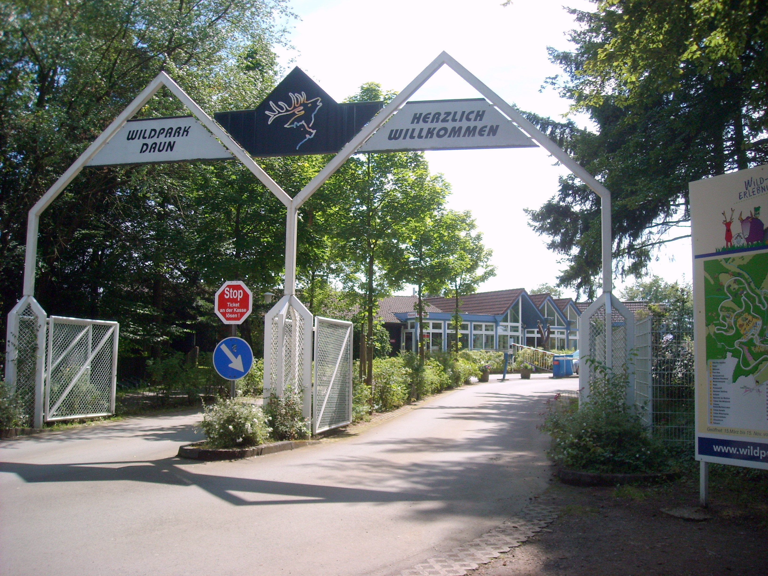 Wildpark in der Eifel (am 5.8.2012) Auf der Heimfahrt vom Eifeltreffen nutzten wir noch die Gelegenheit um den nahe gelegenen Wild- und Erlebnispark zu besuchen. Der Eintrittspreis ist mit 7 Euro pro Person moderat. Kinder zahlen 5 Euro. Für Rentner oder Behinderte gibt es keine Ermäßigung. Hunde sind kostenlos, müssen aber im Auto bleiben. Täglich werden von der kleinen Falknerei zwei interessante Flugvorführungen angeboten. Danach besucht man am Besten die Affenschlucht. Hier leben viele Berberaffen auf einem großen Gelände. Aber immer daran denken: Affen sind Tiere und somit unberechenbar. Weiter fährt man dann mit seinem PKW auf einem 8 km langen Rundkurs. An 6 Stationen kann man die Tiere dann von Tribünen aus beobachten. Hier sollte man sich sehr viel Zeit lassen. Am Ende der Tour können sich dann die Kleinen auf dem großen Spielplatz austoben. Kinder die immer noch nicht genug von den Tieren haben, können einen kleinen Streichelzoo besuchen. Während die Kleinen spielen, kann man dann hoffentlich im Freien sitzen und bei einer kleinen Mahlzeit den schönen Tag ausklingen lassen. |